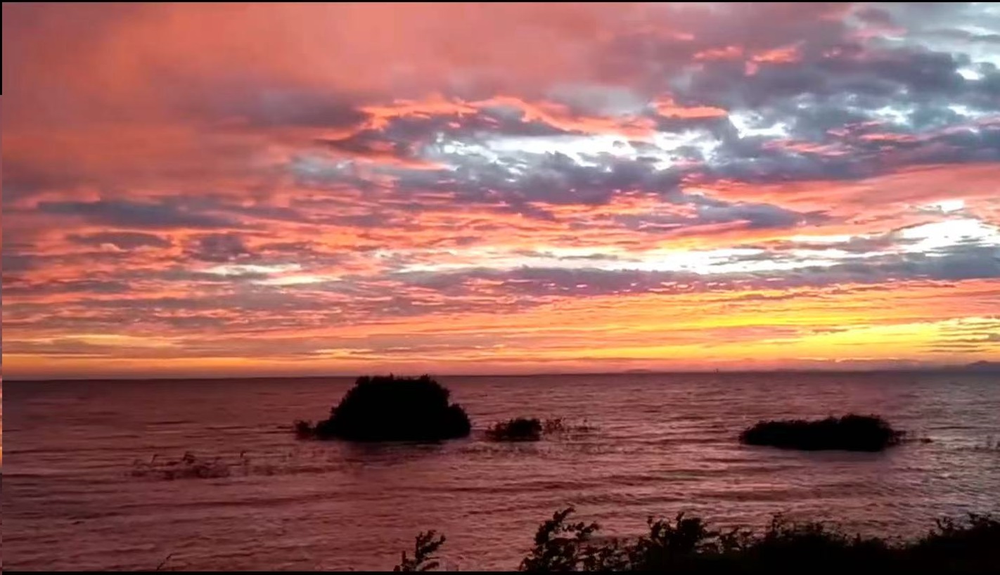 《湖光相约》其二夕阳醉了 湖光如梦满湖的橙霞 仿佛是祂深情的目光每当黄昏来临 夕阳总会如约而至轻轻地将祂的
